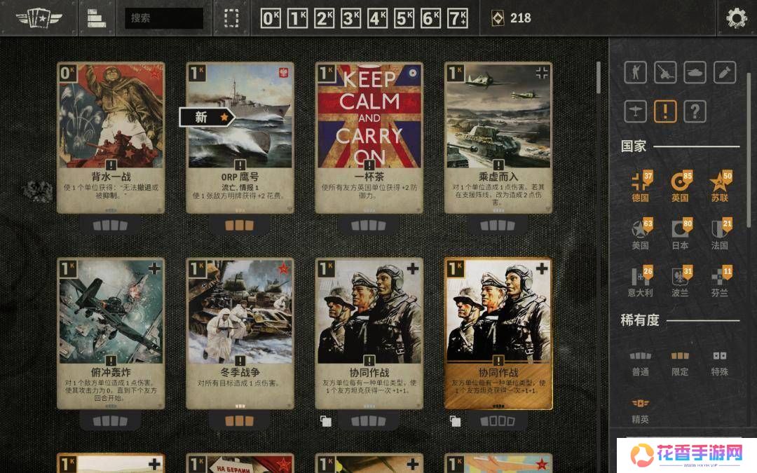 玩家可以从英、美、日、德、苏五个国家中选择一个作为盟国,并从其他国家中选择一个作为对手。每个卡组至少包含28张主国卡牌,这些卡牌中的单位卡均为历史上真实存在的部队和武器,而指令卡则与该国家的历史事件、政策和思潮紧密相关。游戏中的背景音乐也是精心挑选的二战时期流行歌曲,当玩家使用对应主国时,会播放相应的曲目,进一步增强了游戏的代入感。
