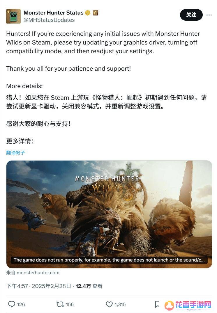 卡普空官方在Monster Hunter Status账号上发布了一则公告,针对玩家在Steam平台上遇到的各类问题,给出了详细的解决建议。公告中提到,玩家可以尝试更新显卡驱动、关闭兼容性模式,并调整游戏设置来改善游戏体验。