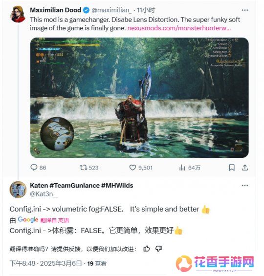 推主@maximilian_分享了一款MOD,可关闭《怪物猎人:荒野》中的镜头失真(Lens Distortion)效果,让游戏画面更清晰。推主表示禁用后“超级怪异的柔和图像终于消失了”,这表明原有的镜头失真效果可能让画面显得模糊或不舒适。