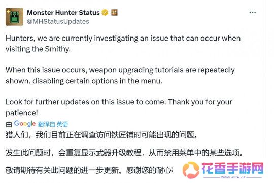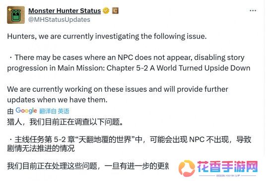 “猎人们,我们目前正在调查以下问题。可能存在NPC不出现的情况,导致主线任务:第5-2章《颠倒的世界》的故事进程受阻。我们目前正在努力解决这些问题,并在有进一步更新时提供。”