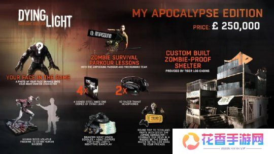 这个《消逝的光芒》典藏版包含许多赠品,其中就包括:将购买者的脸扫描后放入游戏永久保存、等身大小的怪物雕塑、“僵尸生存”跑酷课程、夜视仪,前往Techland参观的全额往返旅行和签名版本的4份游戏。