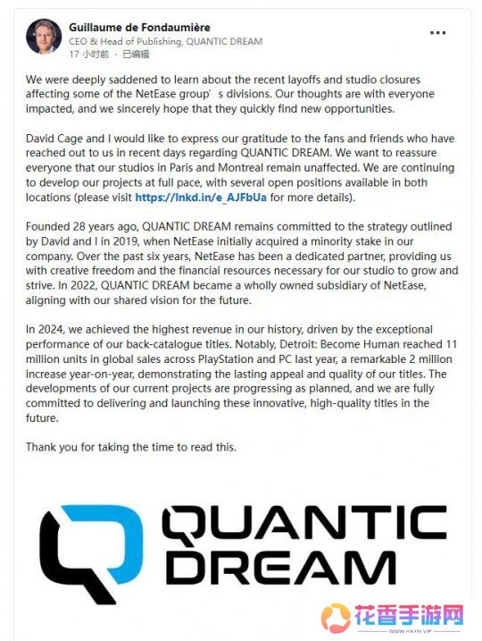 在最近的领英帖子中,量子梦工作室的首席执行官和发行主管Guillaume de Fondaumière谈到了他们目前的状况,他对网易旗下某些工作室关闭和裁员深感悲痛,但量子梦工作室旗下的两个分支机构:巴黎办事处和蒙特利尔办事处,都不会受到任何不利影响,他们的项目正在全速推进中,甚至最近还在招聘新员工。