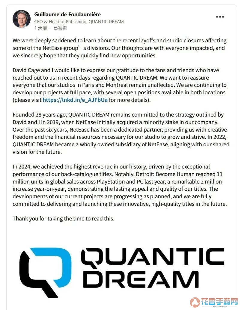 近日,关于网易可能撤回对部分海外工作室投资的传闻引起了广泛关注。针对这一消息,《底特律:变人》的开发商量子梦通过其CEO Guillaume de Fondaumière在领英上的发言,向外界传达了工作室的最新动态。
