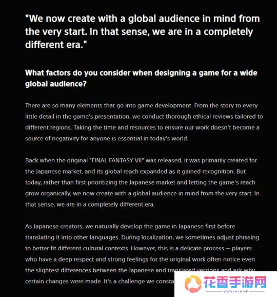 当最初的《最终幻想7》发售时,它主要是为日本市场打造的,随着它的知名度不断提高,其全球影响力也不断扩大。但今天,我们不再优先考虑日本市场,让游戏的影响力自然而然地增长,而是从一开始就考虑到全球受众。从这个意义上说,我们处在一个完全不同的时代。