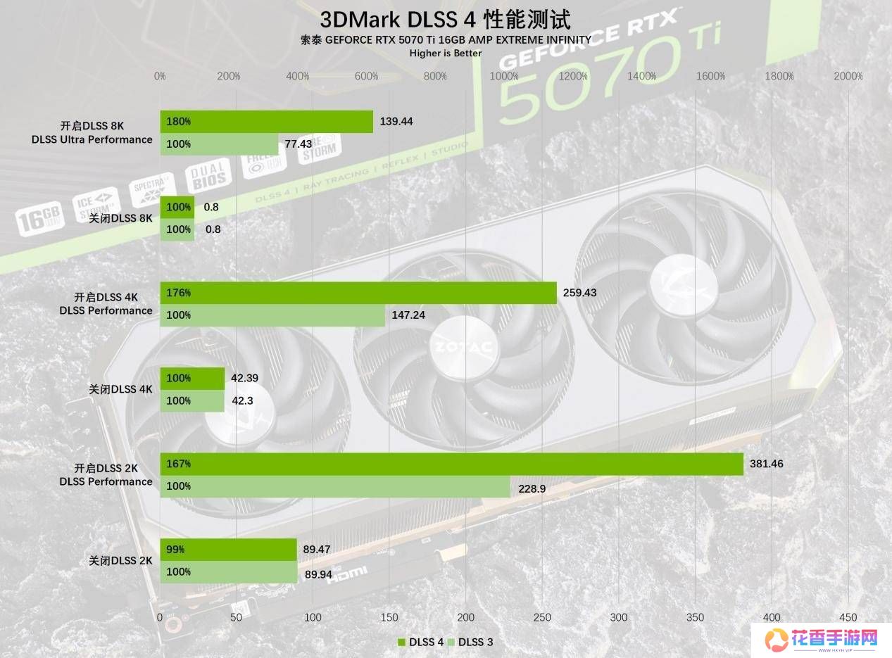 而在DLSS 4专项测试中,索泰RTX 5070 Ti 16GB AMP的性能表现更是令人惊艳。在2K分辨率下,DLSS 4技术的激活使得性能差异达到了4倍;在4K分辨率下,性能提升更是达到了6倍。在8K分辨率下,借助DLSS 4技术,测试DEMO能够稳定运行在139.44 FPS,这证明了高分辨率不再是畅玩游戏的障碍。