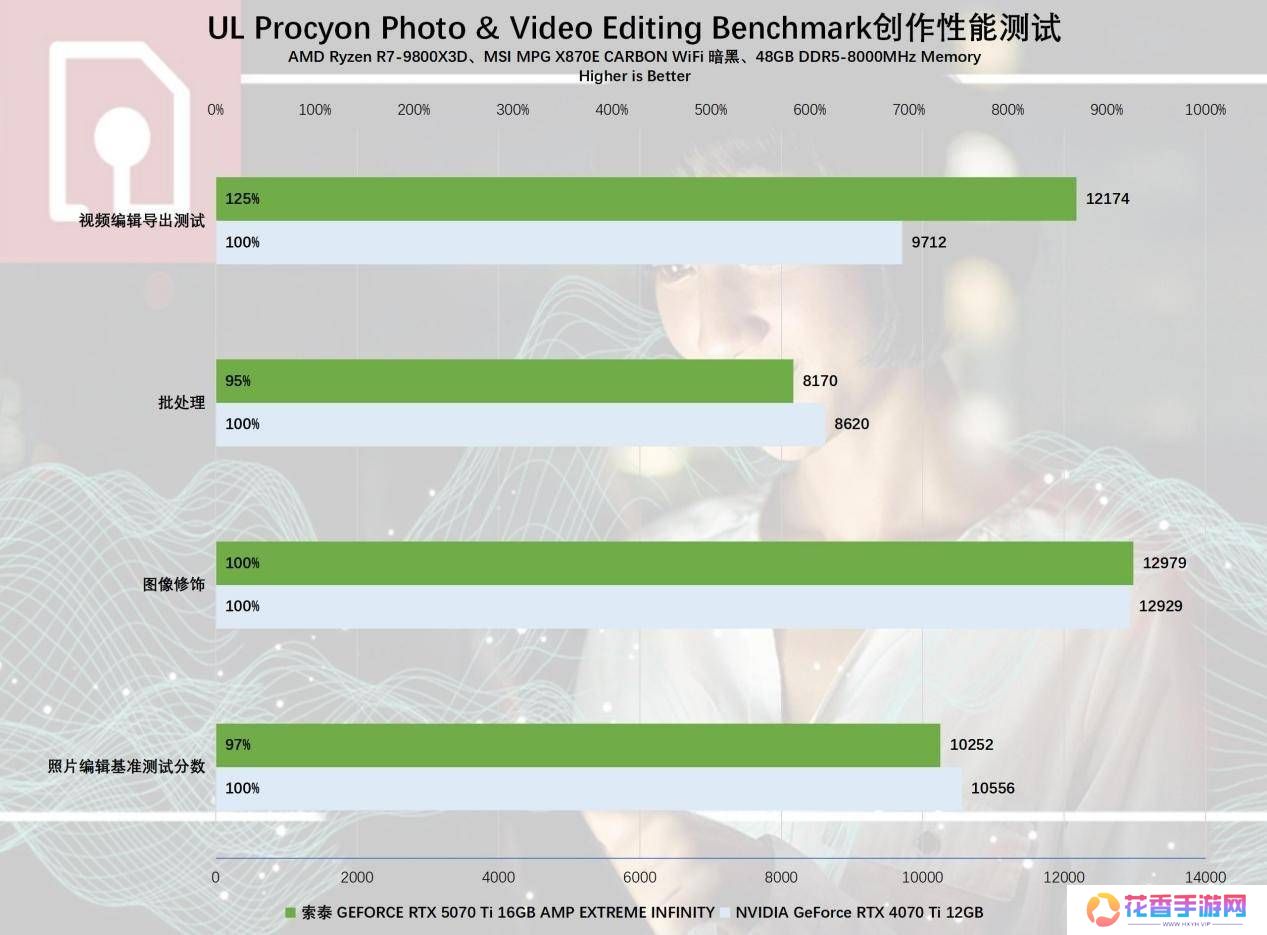 索泰RTX 5070 Ti 16GB AMP在内容创作能力方面也有不俗表现。在PCMark10 Extended测试中,其在游戏和数字内容创作方面的性能提升显著。在平面设计与视频测试中,得益于新一代GeForce RTX 5070 Ti对编码器的进一步升级,其在达芬奇和Premiere Pro的测试中领先上一代产品约13%~33%。