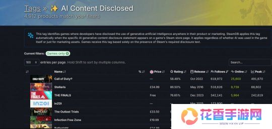 浏览SteamDB的玩家可以在其URL末尾添加&tagid=-1368160,以移除已披露使用生成式AI的游戏。