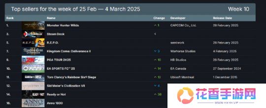 2025年Steam第10周销量榜现已更新。不出所料,三天卖了800万份的《怪物猎人:荒野》,蝉联了榜首位置。本期榜单,新发布游戏并不算太多,但也存在异军突起的黑马作品。具体排名如下——