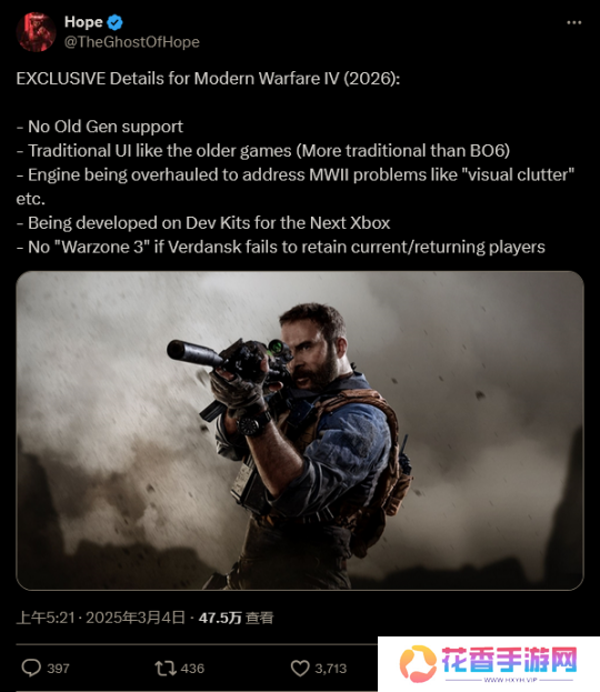 Hope 称,2026 年的新作与预计今年末推出的作品不同,根据此前的另一个泄露消息称,2025 年的《使命召唤》仍将登陆上世代 PS4 和 Xbox One 主机;而新作则是为了次世代开发,并且不会支持旧世代硬件。这也意味着如果该消息属实,2026 下半年我们将能够看到新的 Xbox 硬件。