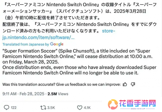 不过日本任天堂宣布,会员游戏库中一款名为《超统构足球》的足球游戏将在3月28日下架,这是任天堂首次从其NSO会员游戏库中下架作品。