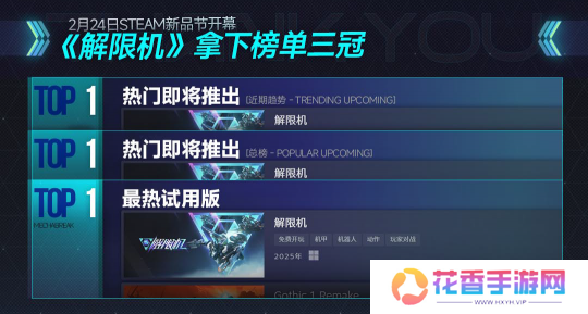 活动上线初始,《解限机》便成功包揽了新品节的三项榜单第一:热门即将推出(趋势榜/总榜),以及最热试用版榜。