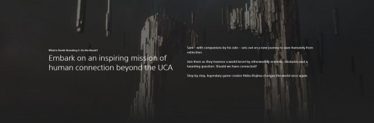 “山姆和同伴们一起踏上了拯救人类免于灭绝的新旅程。和他们一起穿越一个被超自然敌人、障碍和一个挥之不去的问题所困扰的世界:我们应该联系起来吗?传奇游戏创造者小岛秀夫一步步再次改变了世界。”