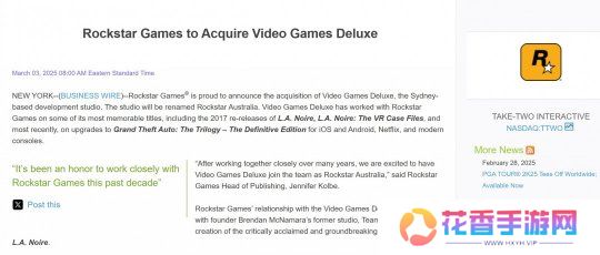 Take-Two也在官方声明中表示:“多年来与Video Games Deluxe密切合作,我们很高兴他们能加入我们的澳大利亚团队。”