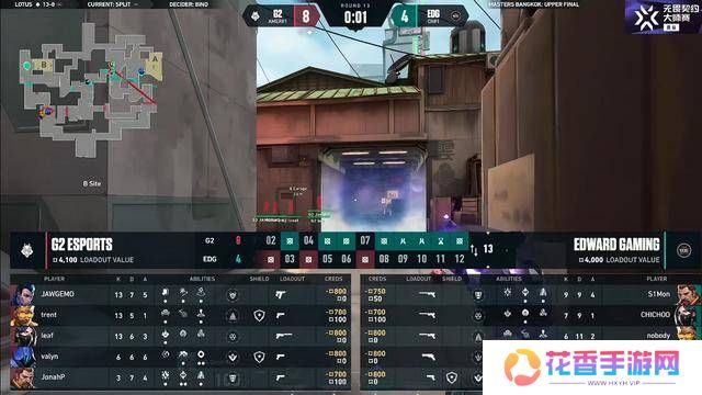 首局比赛在莲华古城地图上展开。EDG在开局阶段表现出色,通过精准的补枪和默契的配合,迅速赢下了手枪局。然而,G2并未因此气馁,他们在奖励局中稳扎稳打,成功追回两分。比赛进入胶着状态,双方你来我往,展开了激烈的攻防战。关键时刻,EDG在A点通过精妙的战术布置,成功骗到了G2钛狐的大招,并趁机发起快攻,一举拿下B进C,取得了比分上的领先。