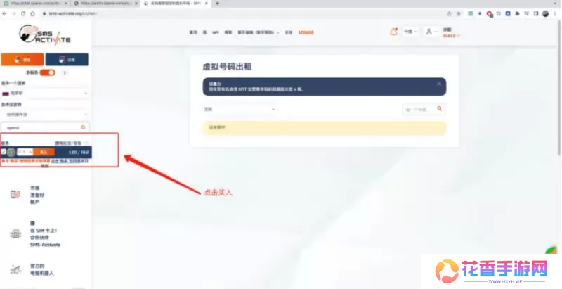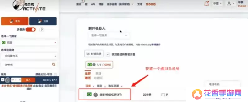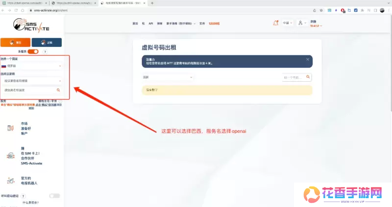 9、可以去租借虚拟号码,选择巴西,服务名选择[openai]。