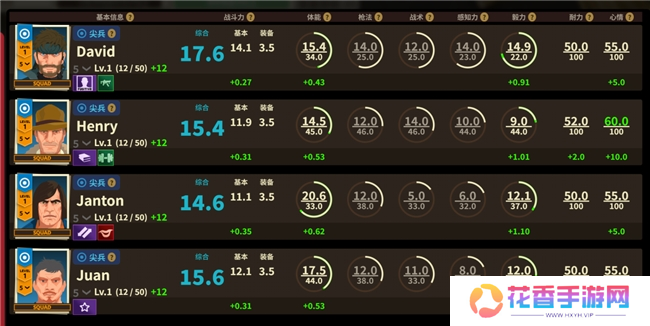 游戏中玩家的小队最多可以编入4名职员,他们不仅有不同职业,还有不同的天赋与能力值,你可以在猎人那里根据自己的需求招募员工。比如你有了个非常抗揍几十子弹都打不死的前排先锋兵,那后排的狙击手只要枪法够准,那身体再虚弱也不碍事。
