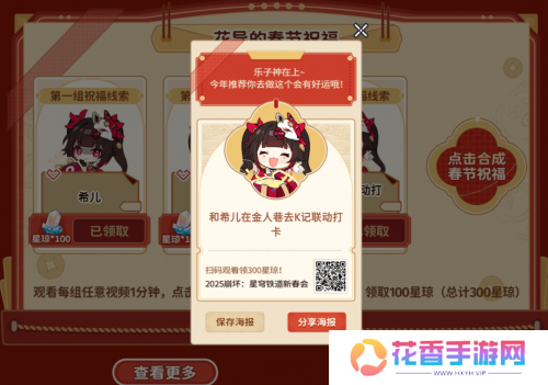除了精彩的二创内容外,与往届新春会相比,本次星穹铁道新春会的展现形式也大有不同。像是星琼福利并不是直接在评论区简介中放出兑换码,而是变成了经过精心设计的互动游戏——作为新春会总导演的花火,为每位玩家都准备了一份春节礼物。玩家只要观看每组任意一个视频1分钟,便能解锁一个祝福线索,并领取100星琼,最终拼成花火为每位玩家送出的新春寄语。