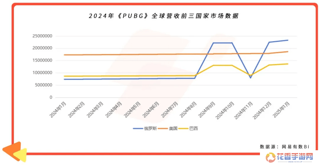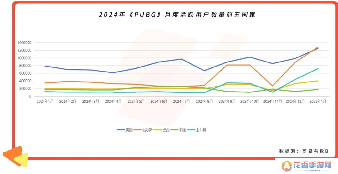 无独有偶,《PUBG》的传统市场与新兴力量的角力格局愈发清晰。美国以125万MAU(2025年1月)保持领先,但俄罗斯、土耳其、巴西等区域市场实现爆发式增长——俄罗斯MAU同比激增270%,土耳其用户规模一年内翻5倍,巴西突破40万大关。这一变化背后,是新兴市场通过移动端渗透、本土化运营与低成本电竞生态对全球游戏格局的重新定义。
