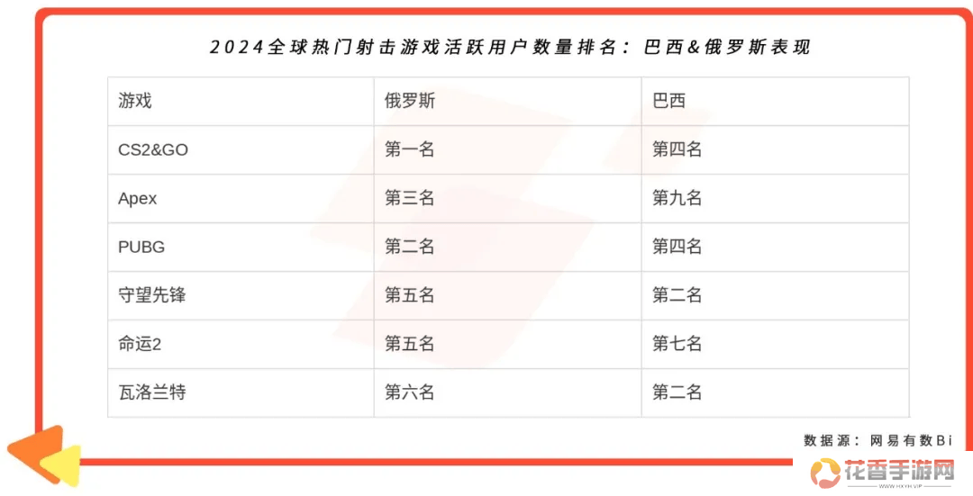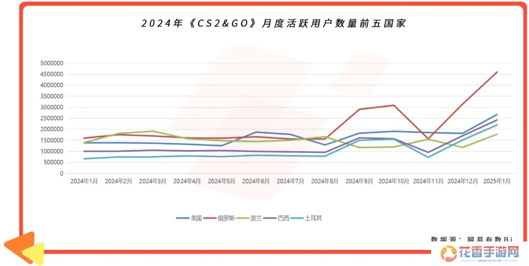 再说到世界范围内的射击游戏,以《CS2&GO》为例,这颗FPS界的常青树,美国市场虽以月均85.2万活跃玩家稳居第一,但俄罗斯、巴西、土耳其等新兴市场增速惊人——俄罗斯MAU同比暴涨187%,土耳其用户规模一年翻倍,巴西MAU突破240万。俄罗斯市场的MAU已经超越美国的267.5万的近2倍,达到459.6万。