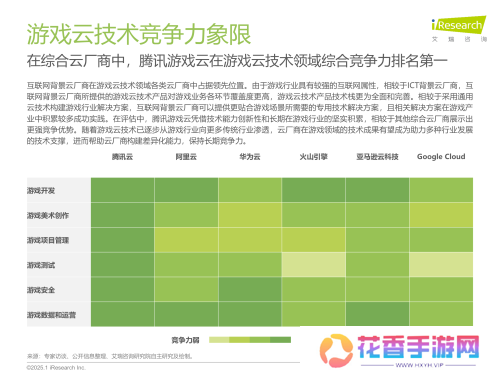近日,国内权威研究机构艾瑞咨询发布《2025年中国游戏云技术发展洞察报告》(以下简称“报告”),对当前中国游戏云技术的发展现状、竞争力及未来趋势进行了深入剖析。报告指出,在游戏云技术领域,综合云厂商占据主导地位,其中,腾讯云凭借其技术能力和行业积累在游戏云技术领域综合竞争力排名第一。