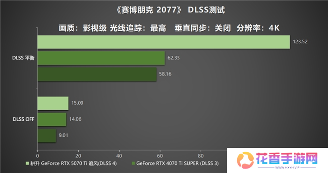 而在4K分辨率测试中可以看到,耕升 GeForce RTX 5070 Ti 追风在启用DLSS 4技术后能够维持在平均123.52帧的水平,其性能提升涨幅约为98%,比GeForce RTX 4070 Ti SUPER和GeForce RTX 4070 Ti有着近2倍的性能提升。随着分辨率的提高,玩家需配备更高性能的GPU以支持高分辨下的流畅运行,而耕升GeForce RTX 5070 Ti 追风在DLSS 4技术的加持下,其卓越的性能表现足以确保游戏的画面流畅,让玩家可以获得更为极致的游戏体验。