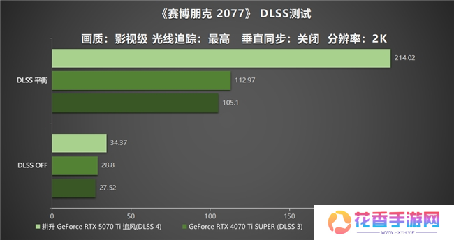 从2K测试中可以看到,耕升 GeForce RTX 5070 Ti 追风借助NVIDIA DLSS 4技术,能够获得高达214.02帧的平均帧数,可见耕升 GeForce RTX 5070 Ti 追风与上一代的两款显卡相比,其性能提升涨幅约为89%,带来了更为优异的性能提升。由此可见,即便是在《赛博朋克 2077》这款光追游戏中,DLSS 4技术同样带来了非常强大的高性能,不仅能让玩家可以在高分辨率的情况下享受流畅游玩体验,同时还能享受因光线追踪技术带来的更为逼真自然的光影效果。