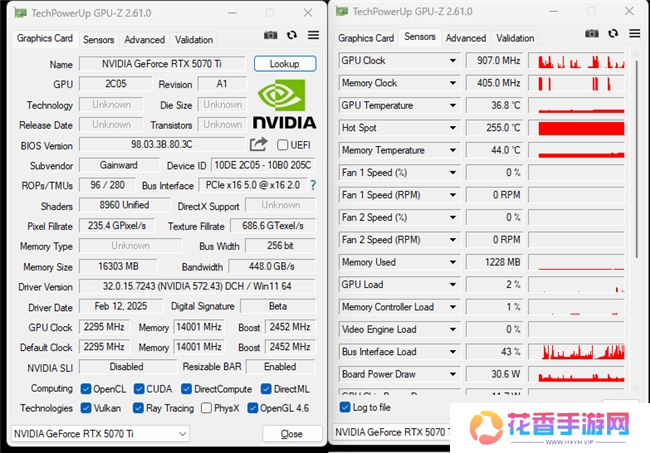 由检测软件GPU-Z可看到耕升 GeForce RTX 5070 Ti 追风更为具体的参数表现和实际规格。通过数据可以看到,在待机状态下,显卡温度为36.8℃,功耗为30.6W。
