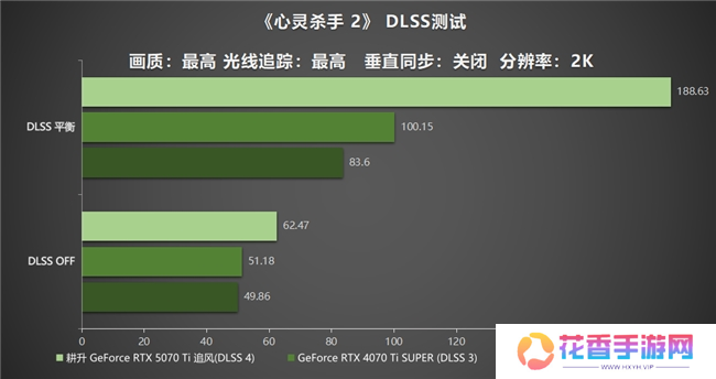 走在画面技术前沿的《心灵杀手2》,是一款支持光线追踪技术的游戏,对所需的硬件配置要求非常的高。在2K分辨率下,《心灵杀手2》在最高画质、光线追踪开启、DLSS打开时,耕升 GeForce RTX 5070 Ti 追风更是能够达到188.63帧。耕升 GeForce RTX 5070 Ti 追风加上DLSS 4技术的加持,可以实现更加细腻的画面和超高帧率,能够让玩家体验到流畅和真实的游戏画面,使得玩家可在高分辨率下一场流畅的游戏体验。