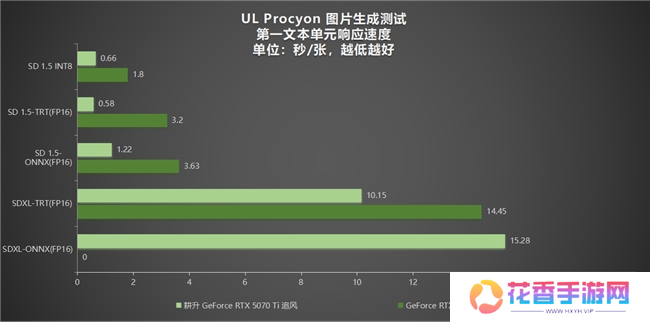 从测试结果可以看到耕升 GeForce RTX 5070 Ti 追风在UL Procyon图片生成性能测试中均有其卓越的性能表现。在SD 1.5-ONNX(FP16)项目测试中,耕升 GeForce RTX 5070 Ti 追风有1.22/s的高速率输出,较GeForce RTX 4070 Ti有近0.6%的领先优势。在SD 1.5-TRT(FP16)和SD 1.5 INT8项目测试中,耕升 GeForce RTX 5070 Ti 追风更是分别拥有高达0.58/s和0.66/s的高速率。总的来说,耕升 GeForce RTX 5070 Ti 追风在AI文本生成领域的有着显著的性能,使其在五个项目中均明显胜过GeForce RTX 4070 Ti。