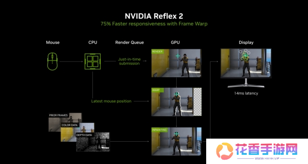全新NVIDIA Reflex 2技术首次采用了Frame Warp技术,该技术可在渲染帧输出至显示器之前,依据实时捕捉的鼠标输入信号进行即时更新,可帮助玩家降低最高75%的系统延迟,提升游戏中的响应速度,让玩家在竞技游戏中能够更快地捕捉目标,更迅速地做出反应并提高瞄准精度。
